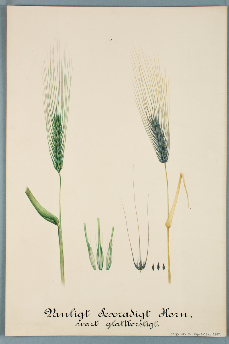 Sveriges kulturväxter. Illustration utförd av Henriette Sjöberg. Korn, sexradigt, svart, glattborstigt. Odlat Experimentalfältet 1887. Signerad "Henriette Sjöberg 1887 Exper. fält.". Jämför NMA.0098599.