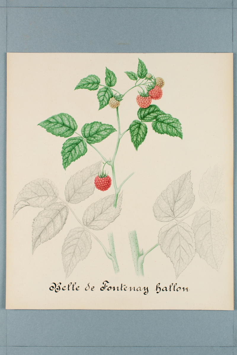 Sveriges kulturväxter. Illustration utförd av Henriette Sjöberg. Hallon, Belle de Fontenay. Odlingsplats och datering saknas.