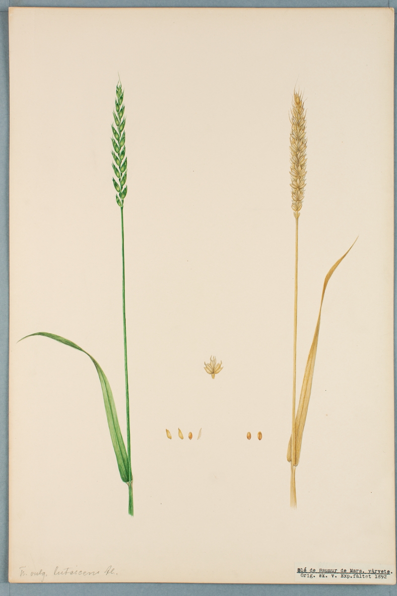Sveriges kulturväxter. Illustration utförd av Henriette Sjöberg. Vete, Blé de Saumur de Mars. Odlat Experimentalfältet 1892. Inv. nr. C101 : 13. Signerad "H.S. 1892. Expe.".
