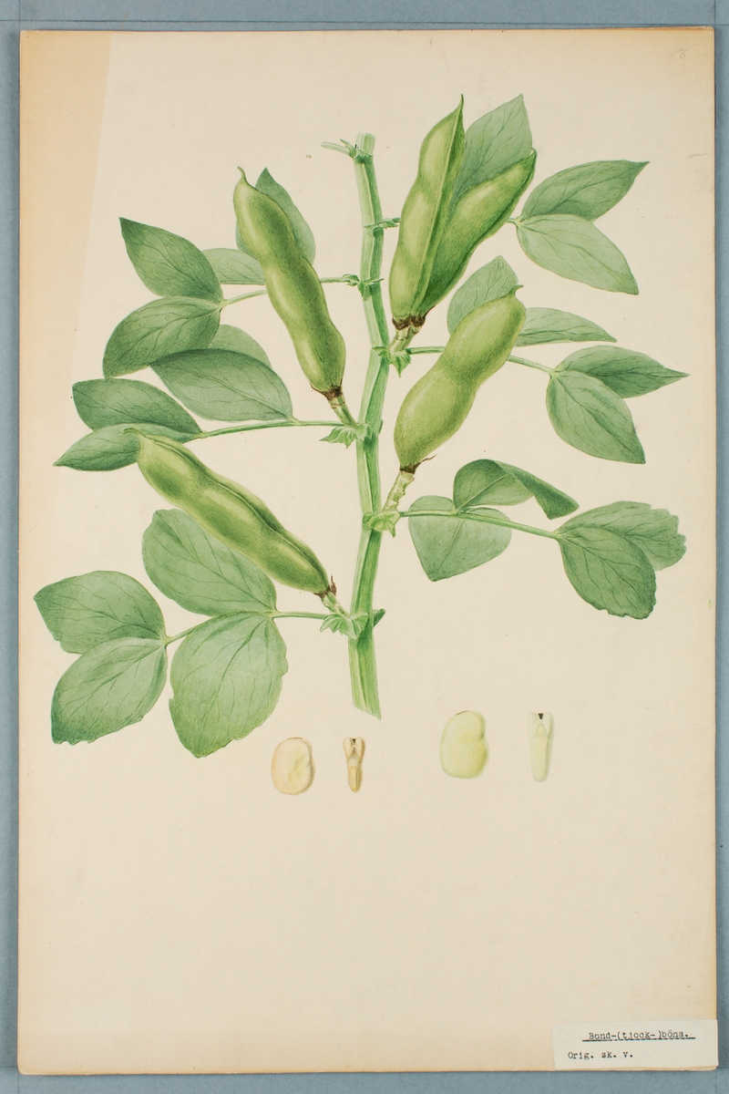 Sveriges kulturväxter. Illustration utförd av Henriette Sjöberg. Bondböna (tjockböna). Odlad Ultuna, datering saknas. Inv. nr. C101 : 442.