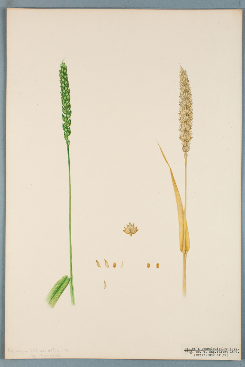 Sveriges kulturväxter. Illustration utförd av Henriette Sjöberg. Vete, Hallet's genealogischer. Odlat Experimentalfältet 1892. Eriksson 1892, nr. 35. Inv. nr. C101 : 51. Signerad "H.S. Exper 1890.".