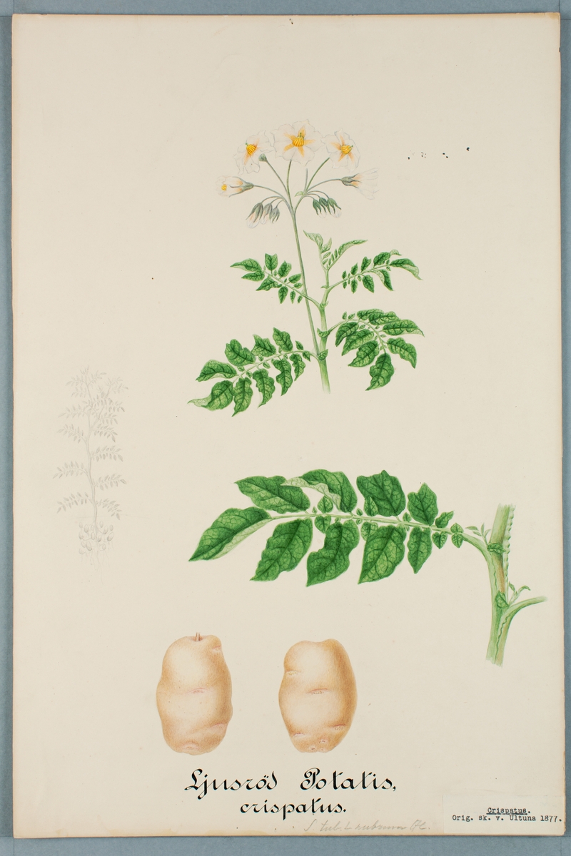 Sveriges kulturväxter. Illustration utförd av Henriette Sjöberg. Potatis, röd, avlång, Crispatus. Odlad Ultuna 1877. Inv. nr. C101 : 334.