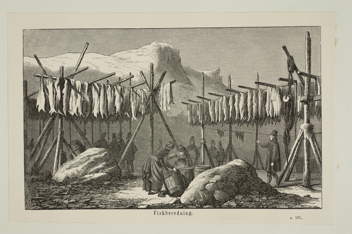 Bildtryck. Fisk som hänger på torkställningar. Text: "Fiskberedning."