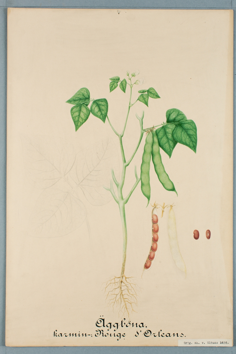 Sveriges kulturväxter. Illustration utförd av Henriette Sjöberg. Äggböna, Rouge d'Orléans, karminfärgad. Odlad Ultuna 1878. Inv. nr. C101 : 481.