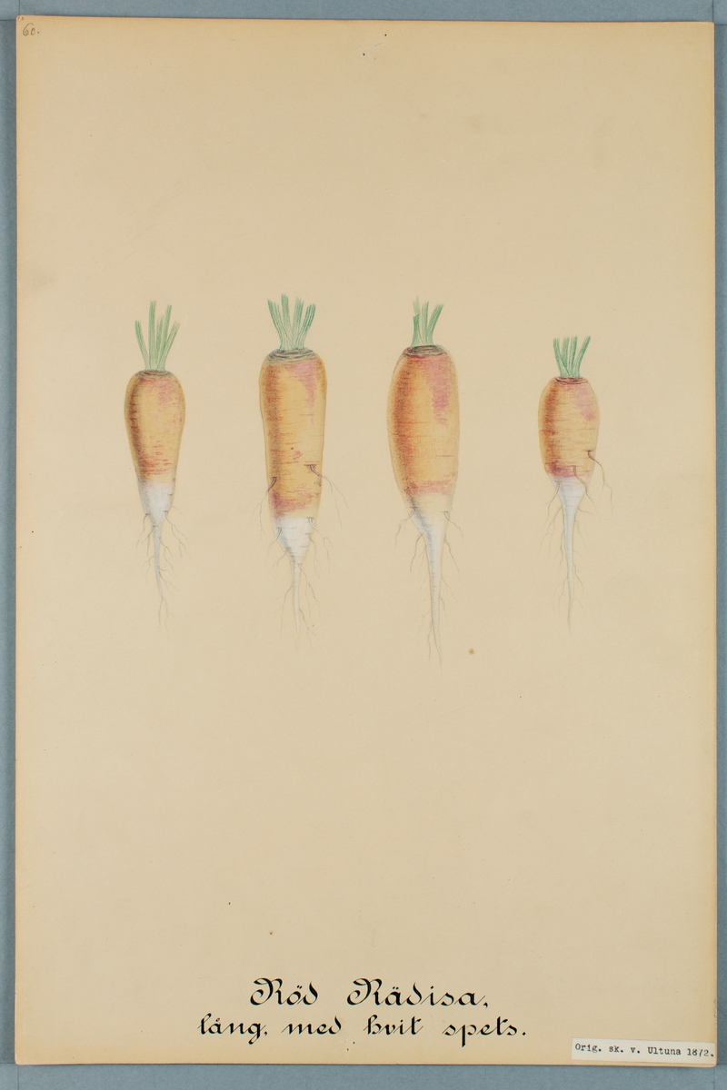 Sveriges kulturväxter. Illustration utförd av Henriette Sjöberg. Rädisa, röd, lång med vit spets. Odlad Ultuna 1872. Inv. nr. C101 : 384 (5). Jämför NMA.0098200.