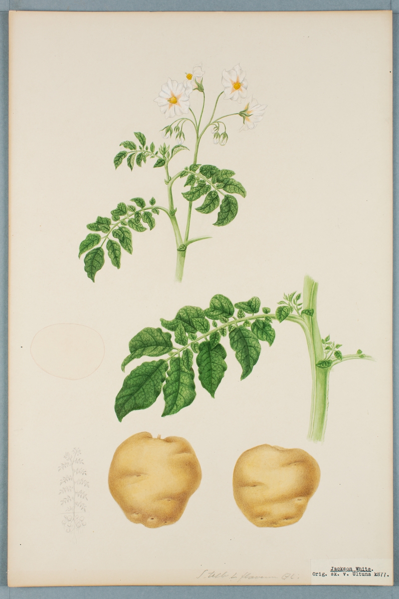 Sveriges kulturväxter. Illustration utförd av Henriette Sjöberg. Potatis, vitgul, Jackson White. Odlad Ultuna 1877. Inv. nr. C101 : 315.