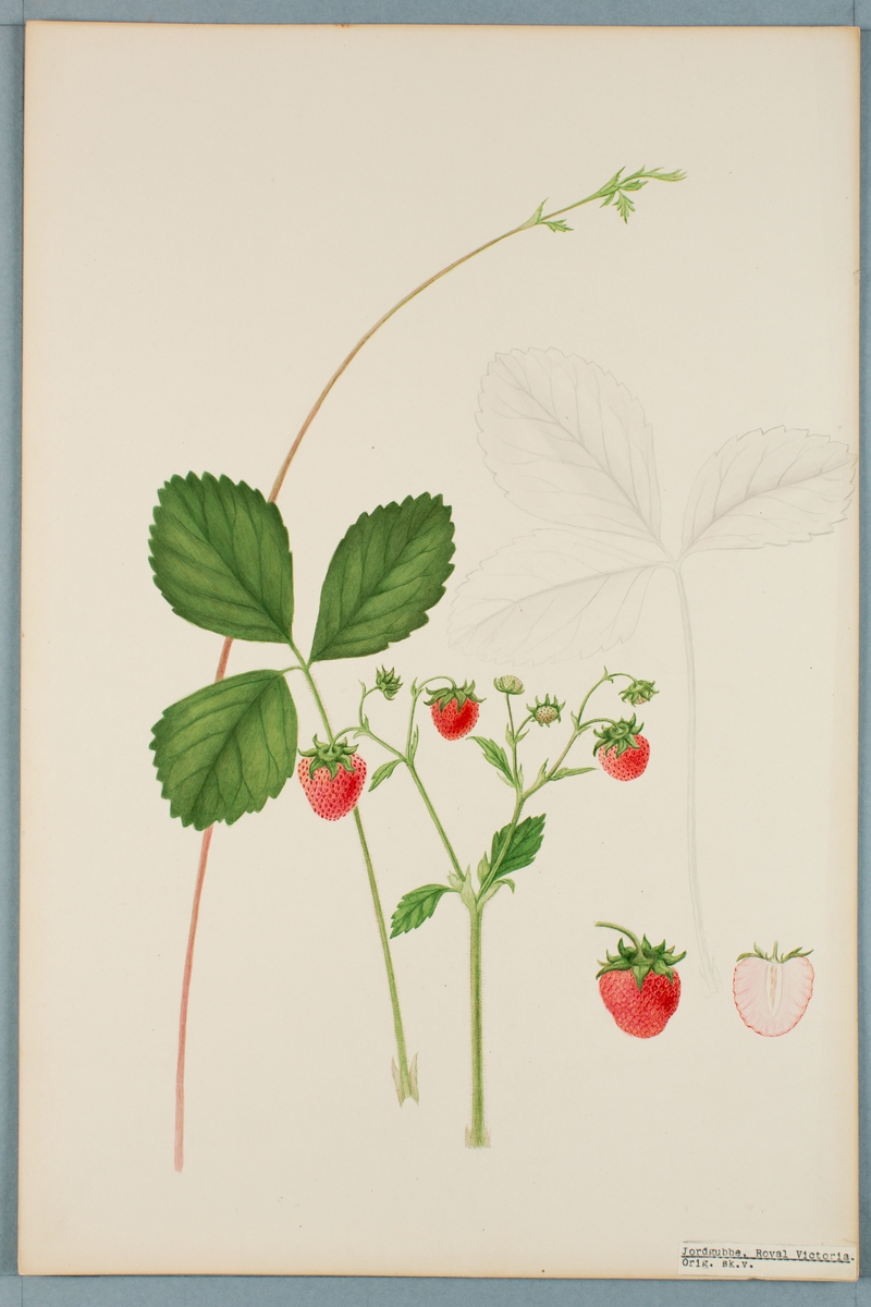 Sveriges kulturväxter. Illustration utförd av Henriette Sjöberg. Jordgubbe, Royal Victoria. Odlingsplats och datering saknas. Signerad "H.S.".