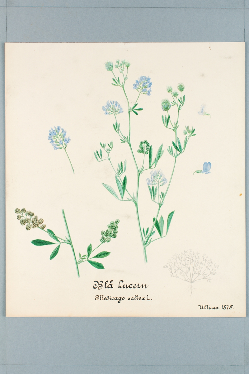 Sveriges kulturväxter. Illustration utförd av Henriette Sjöberg. Blåluzern (Blå Lucern påskrift). Odlad Ultuna 1875.