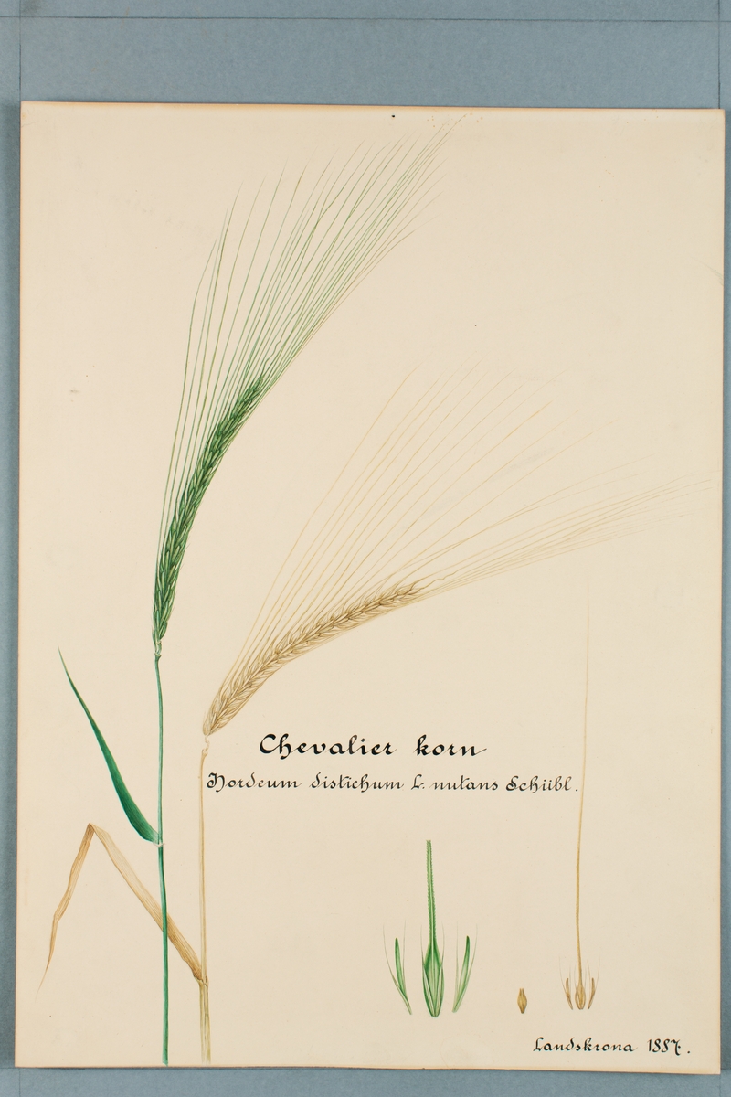 Sveriges kulturväxter. Illustration utförd av Henriette Sjöberg. Korn, tvåradigt, Chevalier. Odlat Landskrona 1887. A. Signerad "Henriette S.g. 1887 Experfält.". Jämför NMA.0098623.