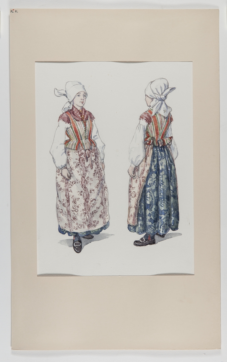 Helgdagsdräkt, kvinnodräkt, Årstads härad, Halland. Akvarell av Emelie von Walterstorff.