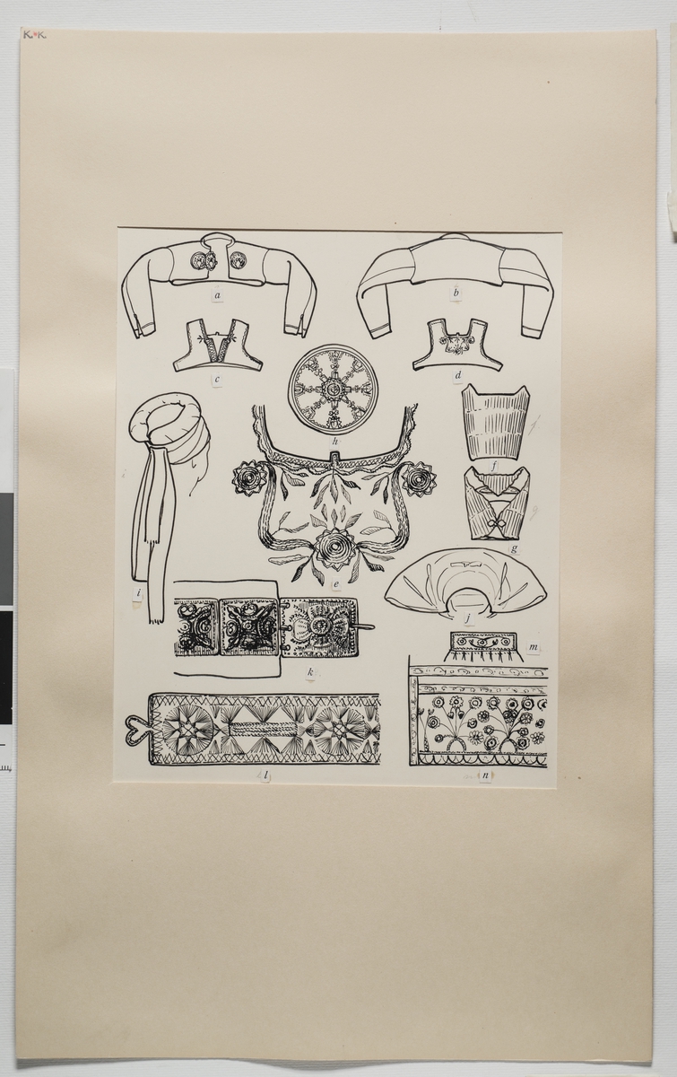 Festdräkt Österåker och Vingåkers socknar, Södermanland. Teckning av Emelie von Walterstorff.