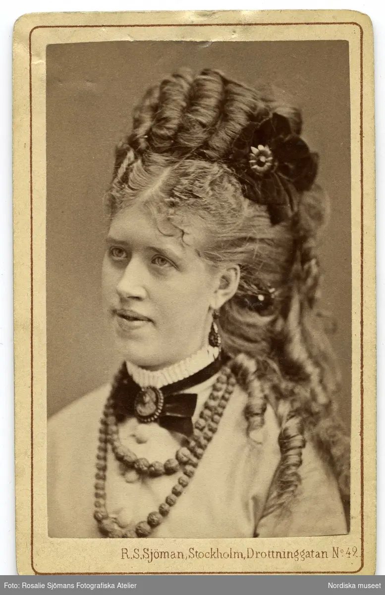 Porträtt av ung kvinna med hög, konstfärdig frisyr med en sammetsblomma som hårsmycke. Kvinnan har en vit skjorta med veckad ståkrage, sammetsband med en kamé runt halsen samt ett pärlhasband och hängande örhängen. 1870-tal.