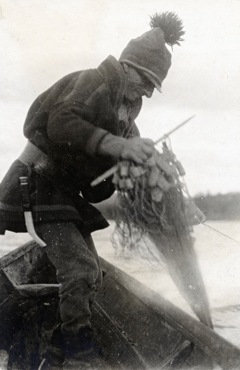 Anders Saitun lägger nät i Tjuonajokk, Norrkaitum, Gällivare socken, Lappland.