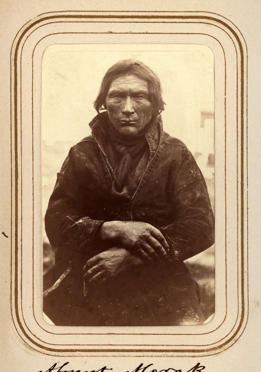 Porträtt av Abmut Merak, 60 år, Sjokksjokks sameby, Jokkmokks socken. Ur Lotten von Dübens fotoalbum med motiv från den etnologiska expedition till Lappland som leddes av hennes make Gustaf von Düben 1868.