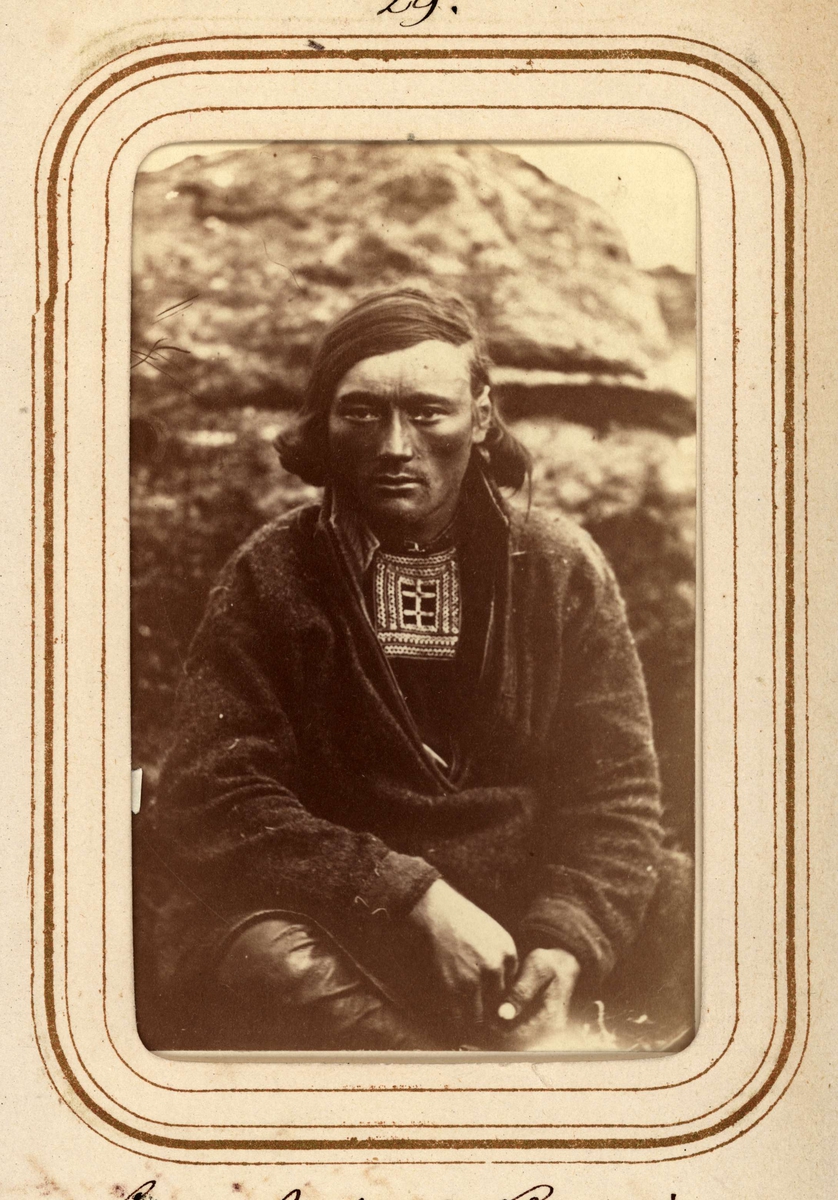 Porträtt av Lars Anders Baggi, 25 år, Jokkmokk. Ur Lotten von Dübens fotoalbum med motiv från den etnologiska expedition till Lappland som leddes av hennes make Gustaf von Düben 1868.