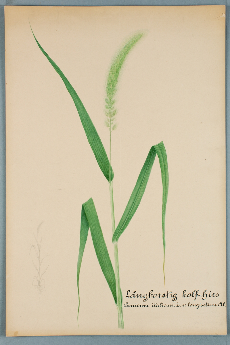 Sveriges kulturväxter. Illustration utförd av Henriette Sjöberg. Hirs, långborstig Kolvhirs. Odlingsplats och datering saknas.