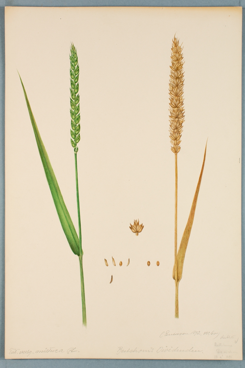 Sveriges kulturväxter. Illustration utförd av Henriette Sjöberg. Vete, Bestehorns Dividenden. Odlat Experimentalfältet 1891. Eriksson 1892, nr. 60. Dublett. Signerad "H.S. 91. Expfel.". Jämför NMA.0098476.
