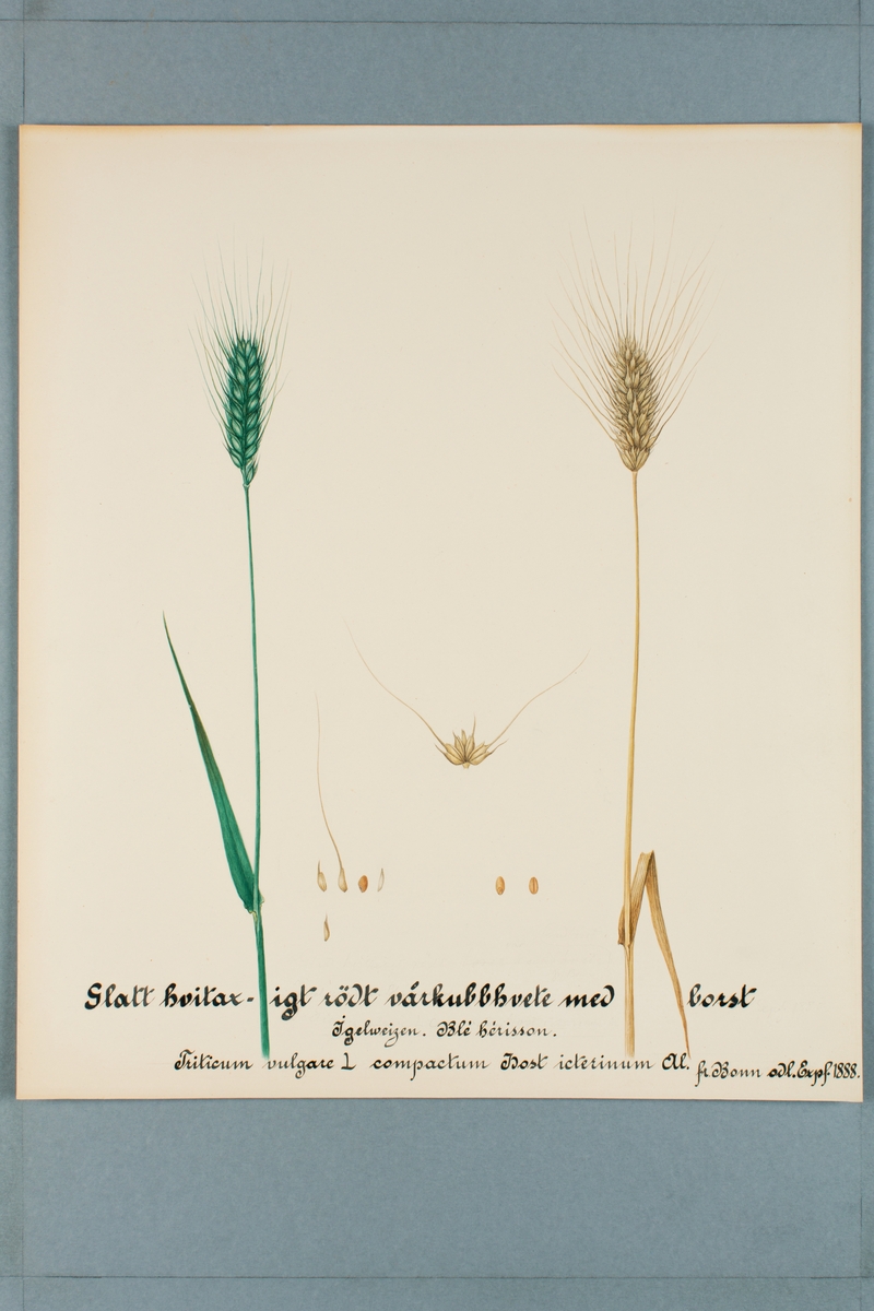 Sveriges kulturväxter. Illustration utförd av Henriette Sjöberg. Vete, Vårkubbvete, vitaxigt, rött, glatt, borstbärande, Igelweizen/Blé herisson. Odlat Experimentalfältet 1888.