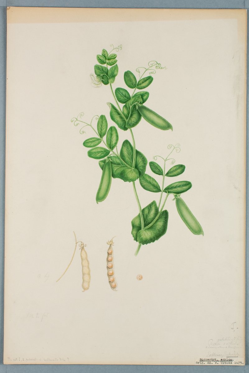 Sveriges kulturväxter. Illustration utförd av Henriette Sjöberg. Sockerärter, enblommig. Odlade Ultuna 1875. Inv. nr. C101 : 419.