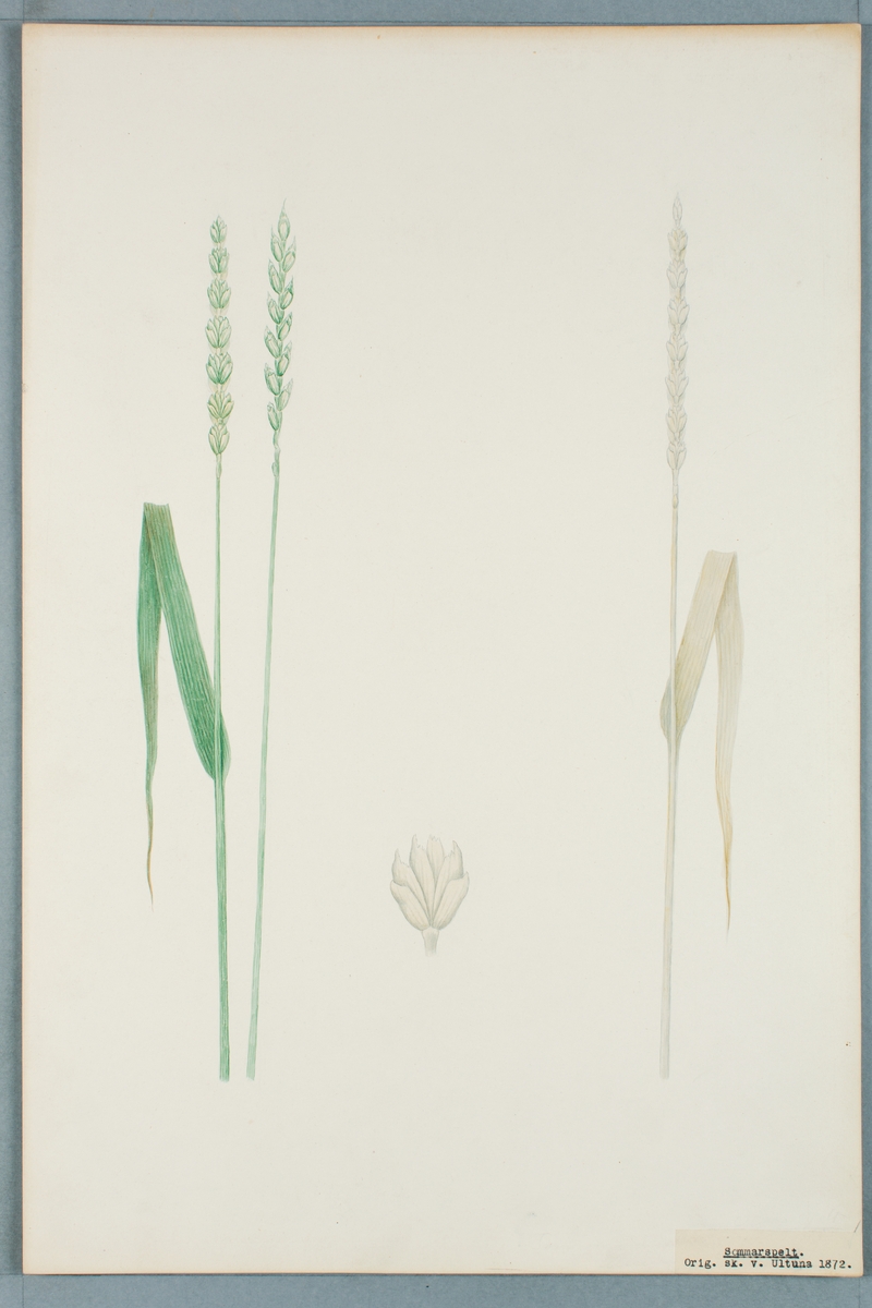 Sveriges kulturväxter. Illustration utförd av Henriette Sjöberg. Vete, Spelt, Sommarspelt. Odlat Ultuna 1872. Inv. nr. C101 : 138.