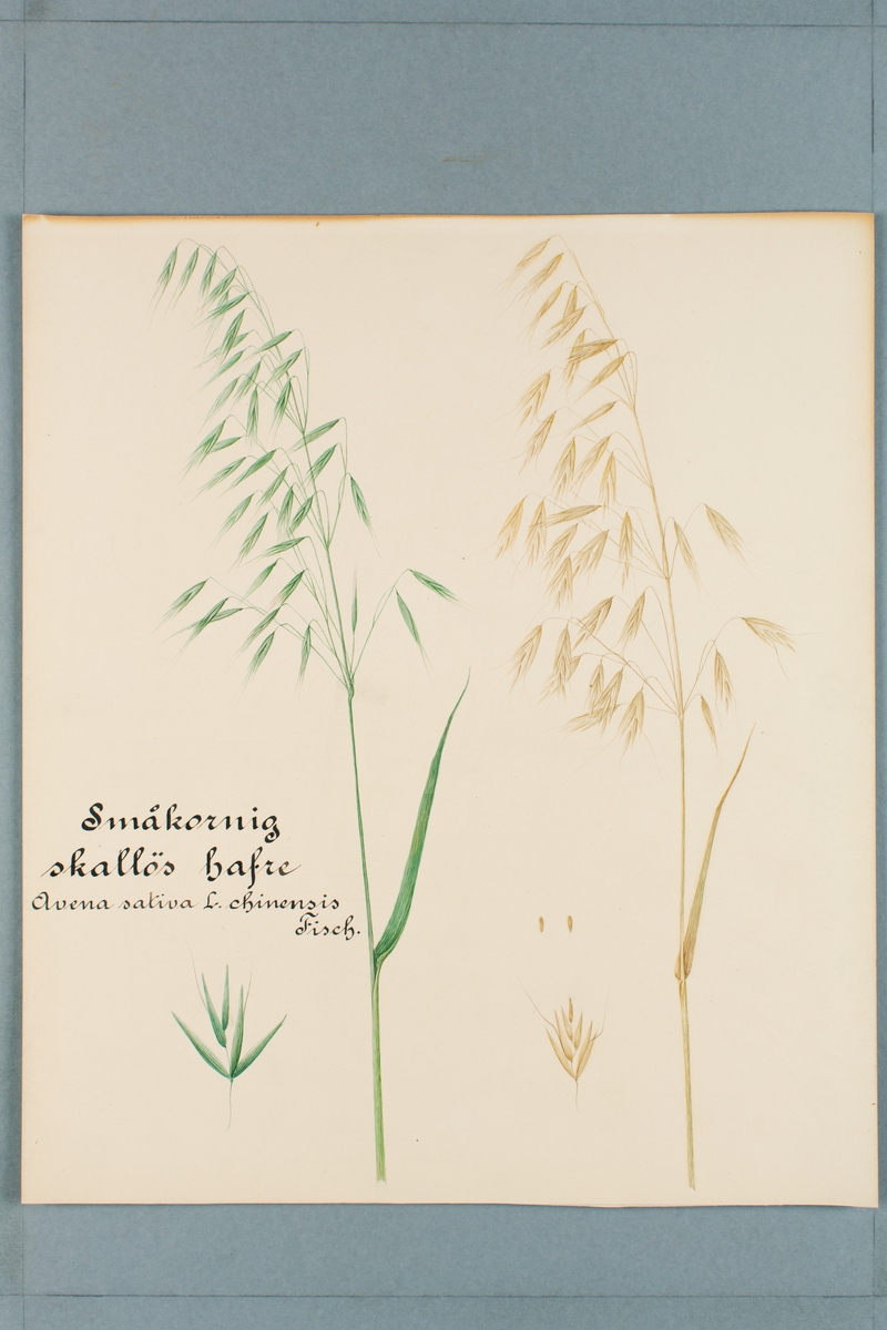 Sveriges kulturväxter. Illustration utförd av Henriette Sjöberg. Havre, skallös, småkornig. Odlingsplats och datering saknas.