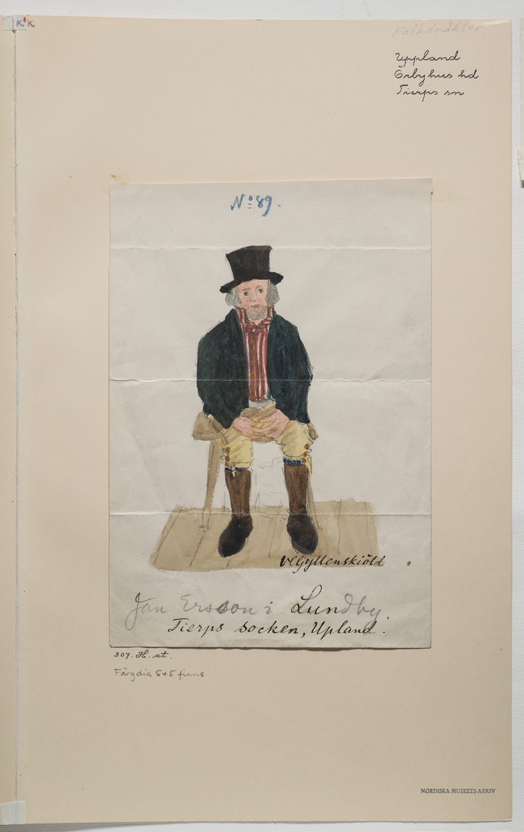Man iklädd folkdräkt med hatt. Akvarell av Gyllenskiöld med påskriften: "No 89. Uppland, Örbyhus härad, Tierps socken. Jan Ersson i Lundby, Tierps socken , Upland. "
