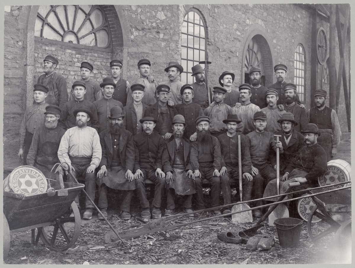 Östergötland. Bankekinds hd. Åtvids sn. Åtvidaberg. Grupp av kopparverksarbetare, Åtvidaberg. Svenska Turistföreningens fot. pristäflan 1900 1. pris J E Thorin Åtvidaberg.