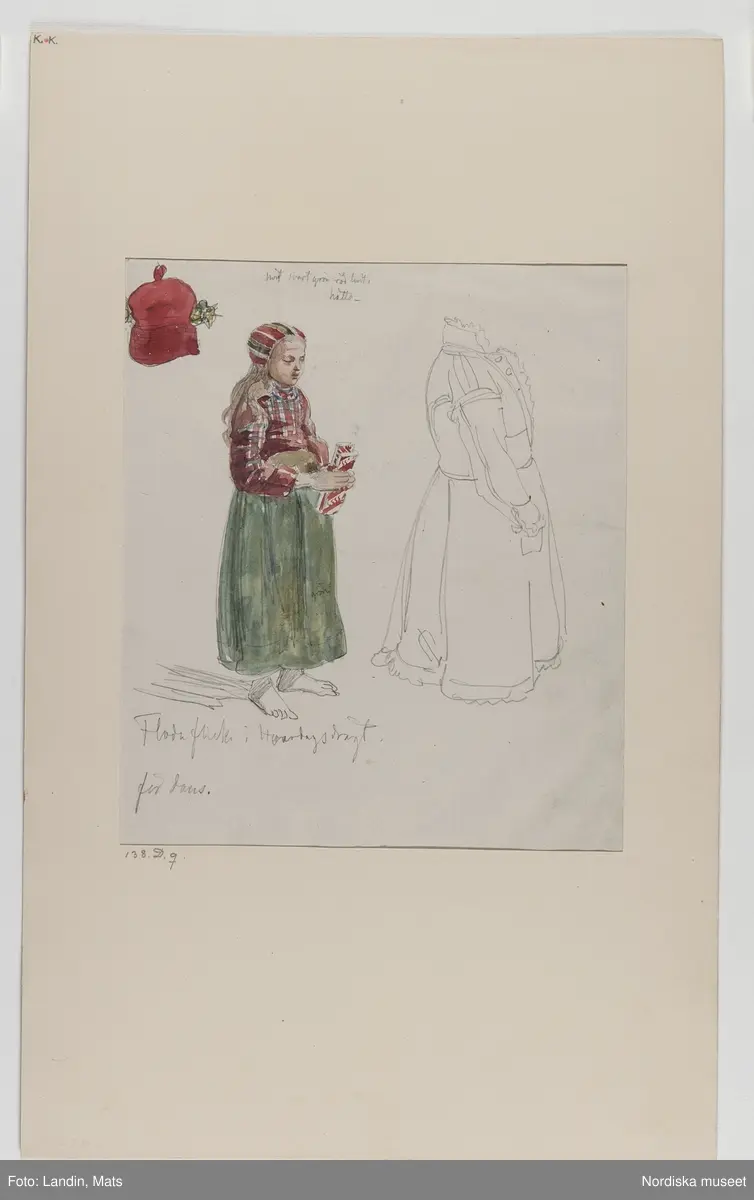 Akvarellerad handteckning av J W Wallander. Flickdräkt från Floda, Dalarna. "Flodaflicka i hvardagsdrägt för dans". Nordiska museets inventarienummer 57339c. Jmfr NMA.0035324.