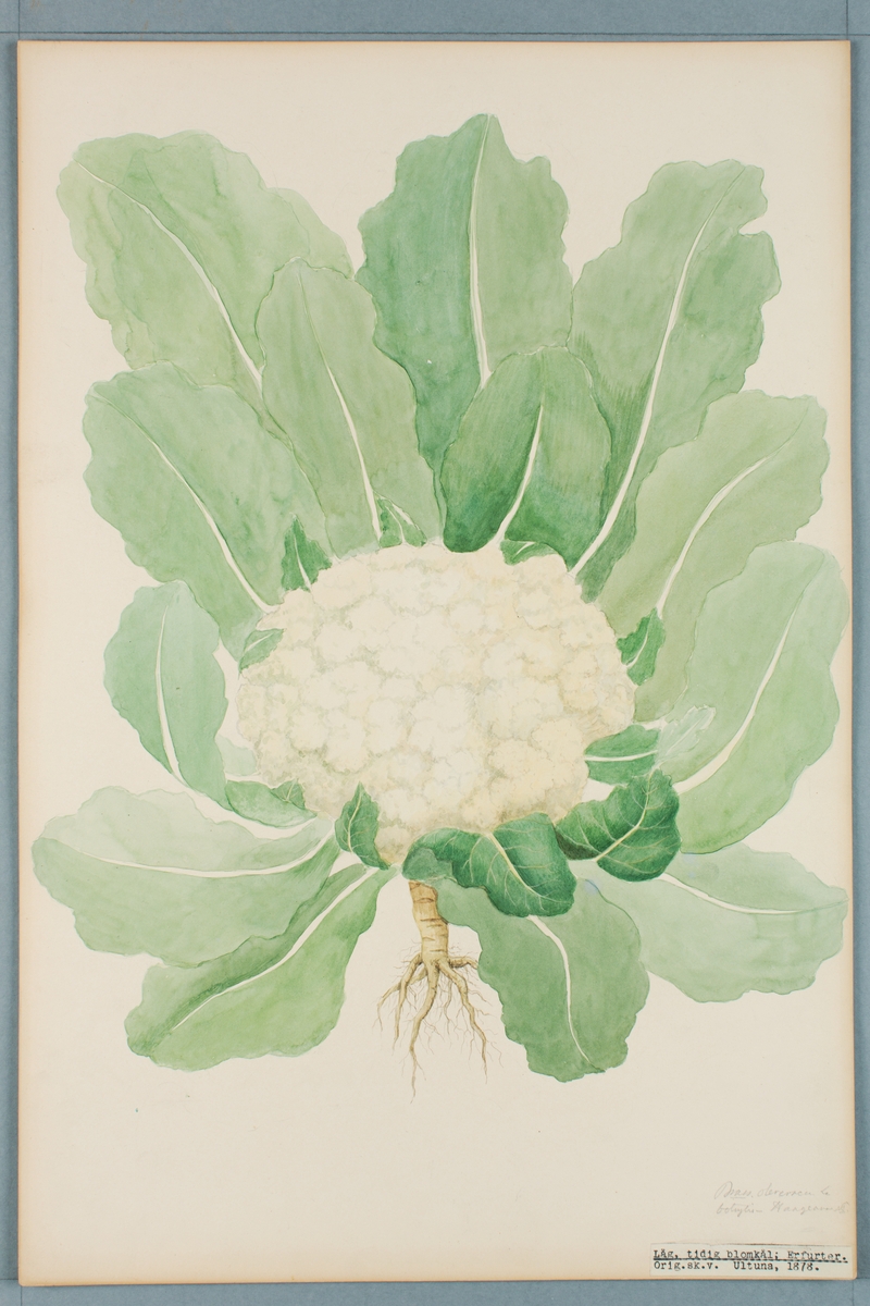 Sveriges kulturväxter. Illustration utförd av Henriette Sjöberg. Blomkål, låg, tidig, Erfurter. Odlad Ultuna 1878. Inv. nr. C101 : 350.