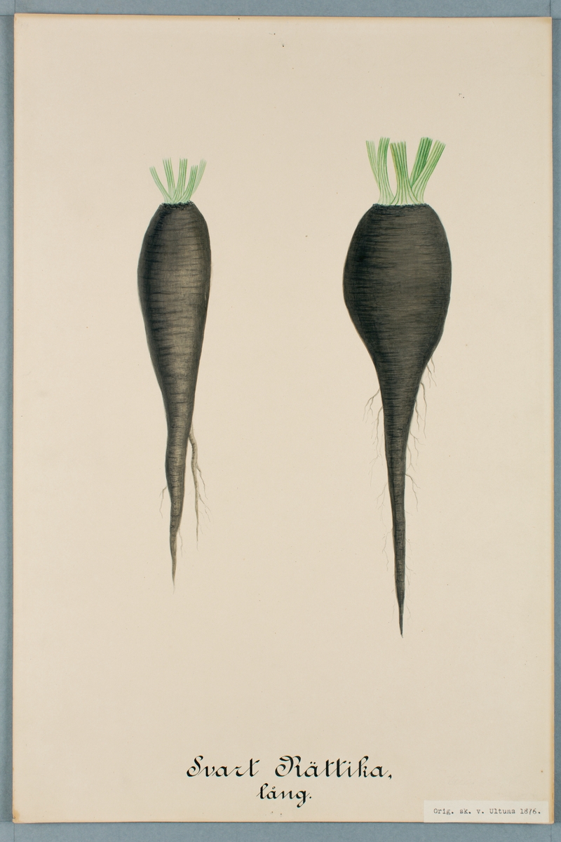 Sveriges kulturväxter. Illustration utförd av Henriette Sjöberg. Rättika, lång, svart. Odlad Ultuna 1876. Inv. nr. C101 : 392.
