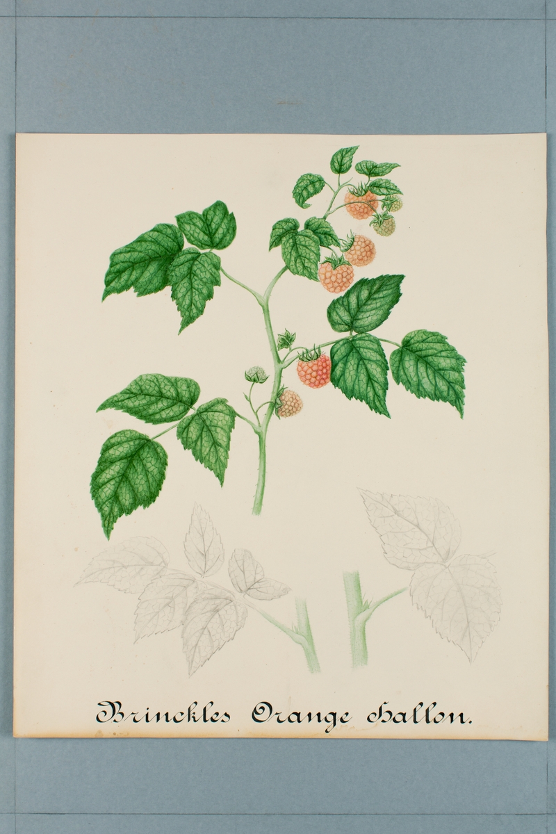 Sveriges kulturväxter. Illustration utförd av Henriette Sjöberg. Hallon, Brinckles orange. Odlingsplats och datering saknas.
