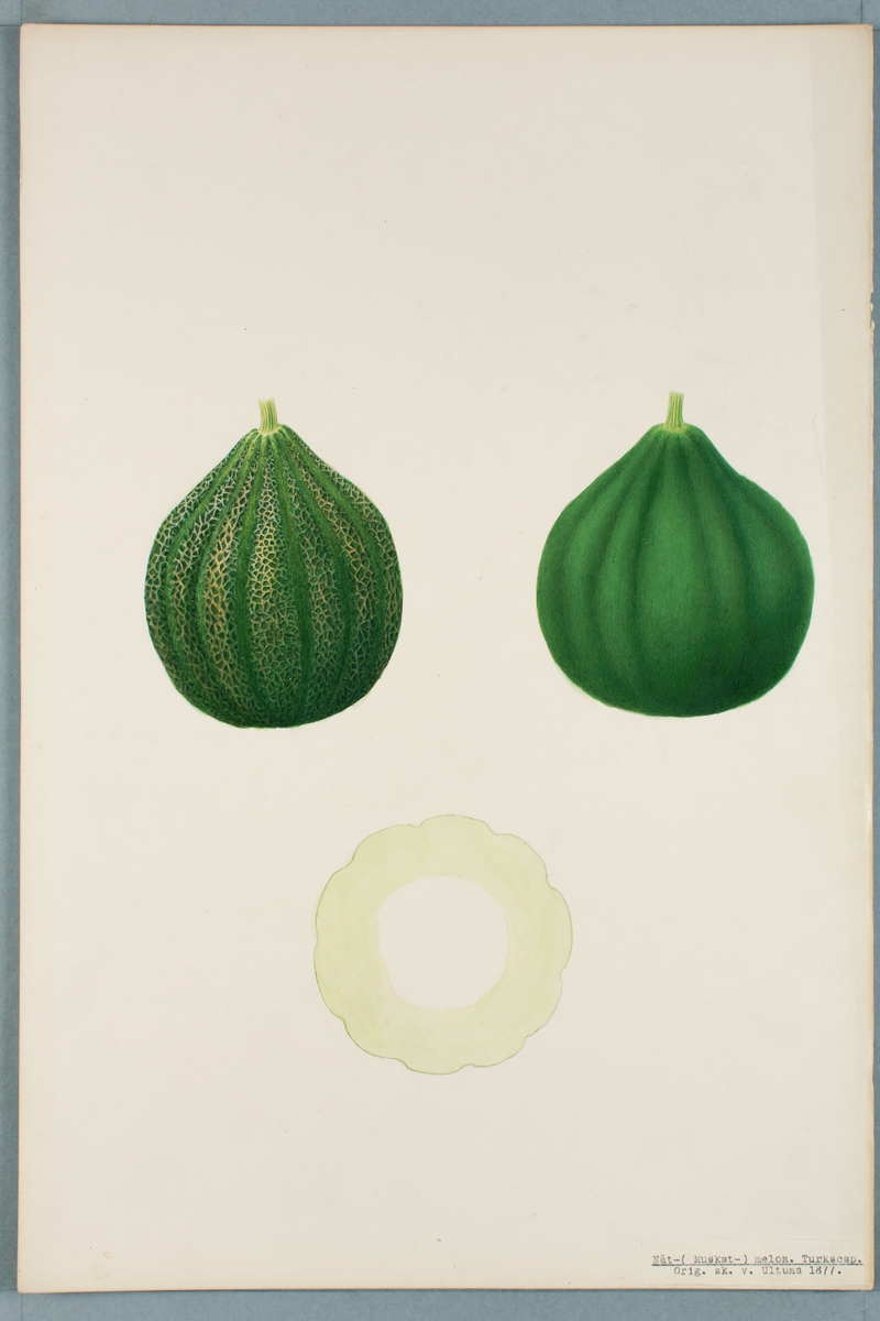 Sveriges kulturväxter. Illustration utförd av Henriette Sjöberg. Melon, nätmelon, Muskatmelon, Turkscap. Odlad Ultuna 1877. Inv. nr. C101 : 521.