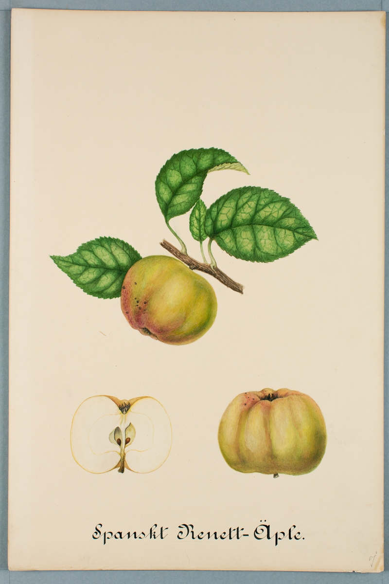 Sveriges kulturväxter. Illustration utförd av Henriette Sjöberg. Äpple, gul, spansk Renett. Odlingsplats saknas, 1884. Signerad "H.S. 1884.".
