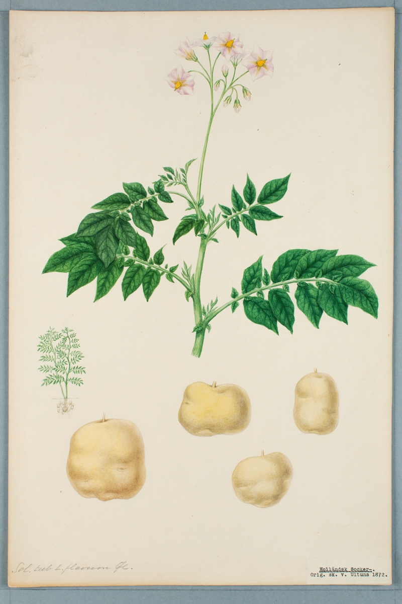 Sveriges kulturväxter. Illustration utförd av Henriette Sjöberg. Potatis, vitgul, Holländsk sockerpotatis/Engelsk mjölig. Odlad Ultuna 1872. Inv. nr. C101 : 318. Jämför NMA.0098405.