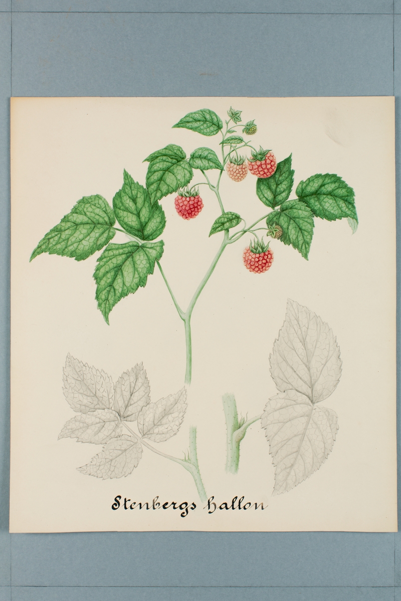 Sveriges kulturväxter. Illustration utförd av Henriette Sjöberg. Hallon, Stenbergs. Odlade Experimentalfältet 1883.