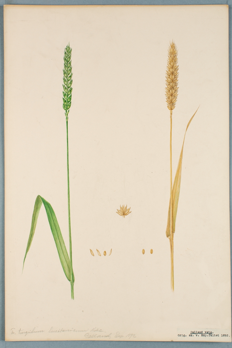 Sveriges kulturväxter. Illustration utförd av Henriette Sjöberg. Vete, Galland. Odlat Experimentalfältet 1892. Inv. nr. C101 : 43. Signerad "H.S. 1892 Exper.".