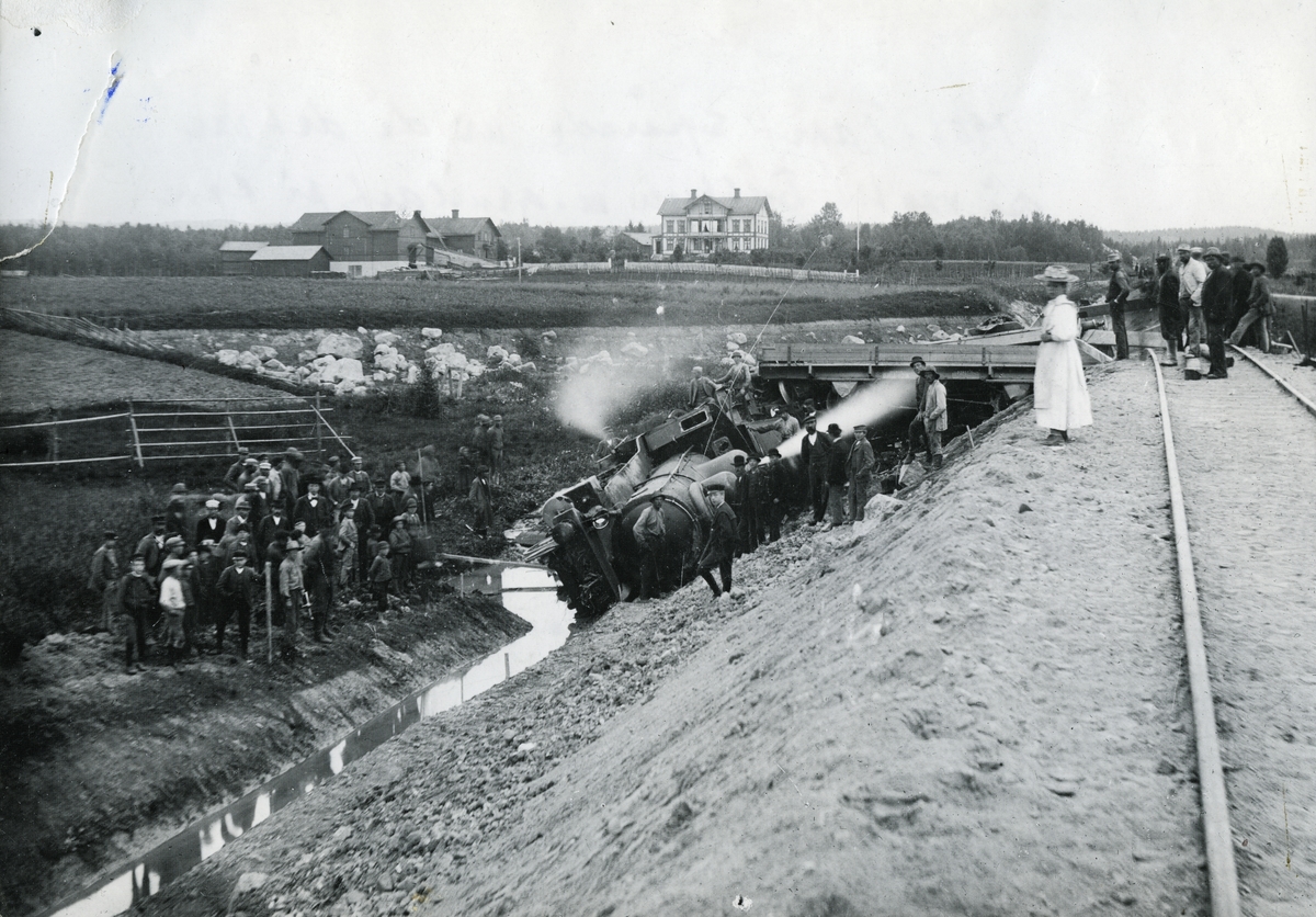 Gruslastat tåg som spårat ur på väg till Edsbyn. Järnvägen var 1900 nybyggd. Vid olyckan fick en man sin ena arm avsliten. I bakgrunden ses "Engmans" som idag ersatts med ålderdomshemmet Sunnangården.