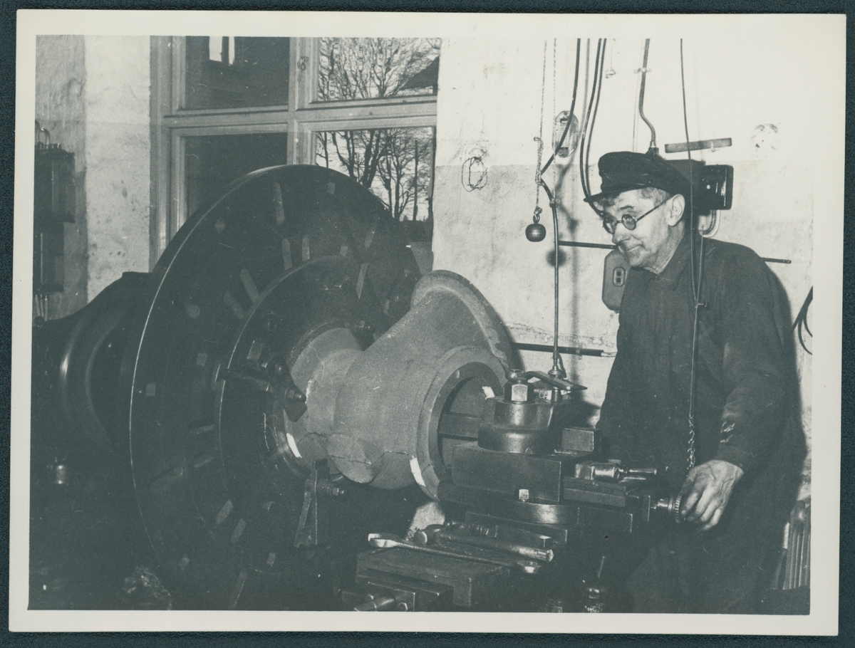 Axel Karlsson vid en plansvarv i mekaniska verkstaden. Han bearbetar flänsarna på en slussventil.