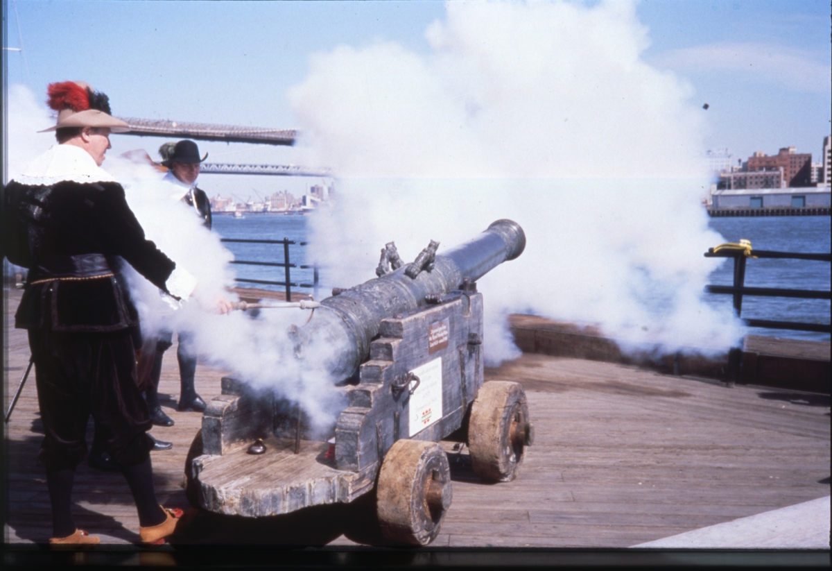 En kanon avfyras i New Yorks hamn i samband med 350-årsjubileet av kolonin Nya Sverige 1988. Två män i 1600-talsdräkter.