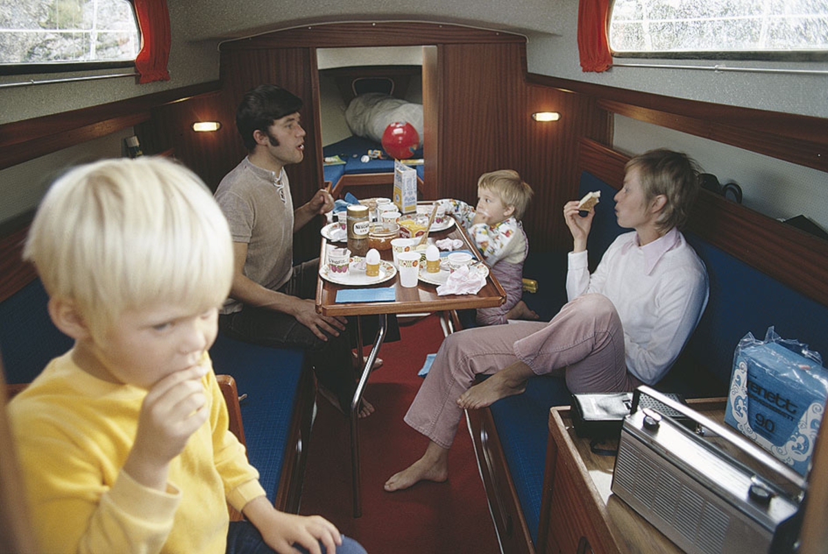 Interiör, ruff i Albin Vega. En familj äter frukost. Marknadsföringbild.