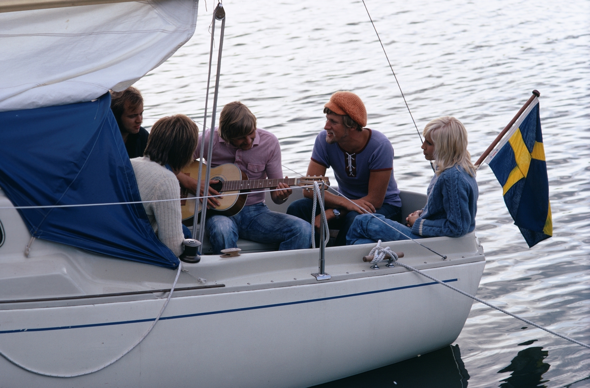 Sällskap i sittbrunnen på en Albin Viggen. Marknadsföringsbild.