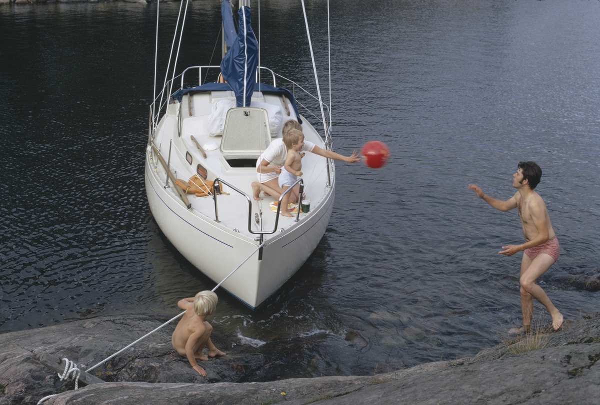 Albin Vega förtöjd vid en klippa. Barnfamilj leker med badboll. Marknadsföringbild.