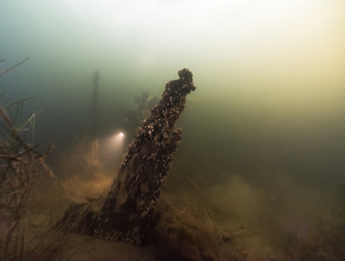 En kraftig bordläggningsplanka som sticker upp ur sedimenten, på vraket efter Blekinge.
