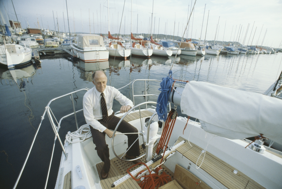 Albin Nova vid brygga i Fiskebäcks hamn. Representant från Albin Marin i sittbrunnen.