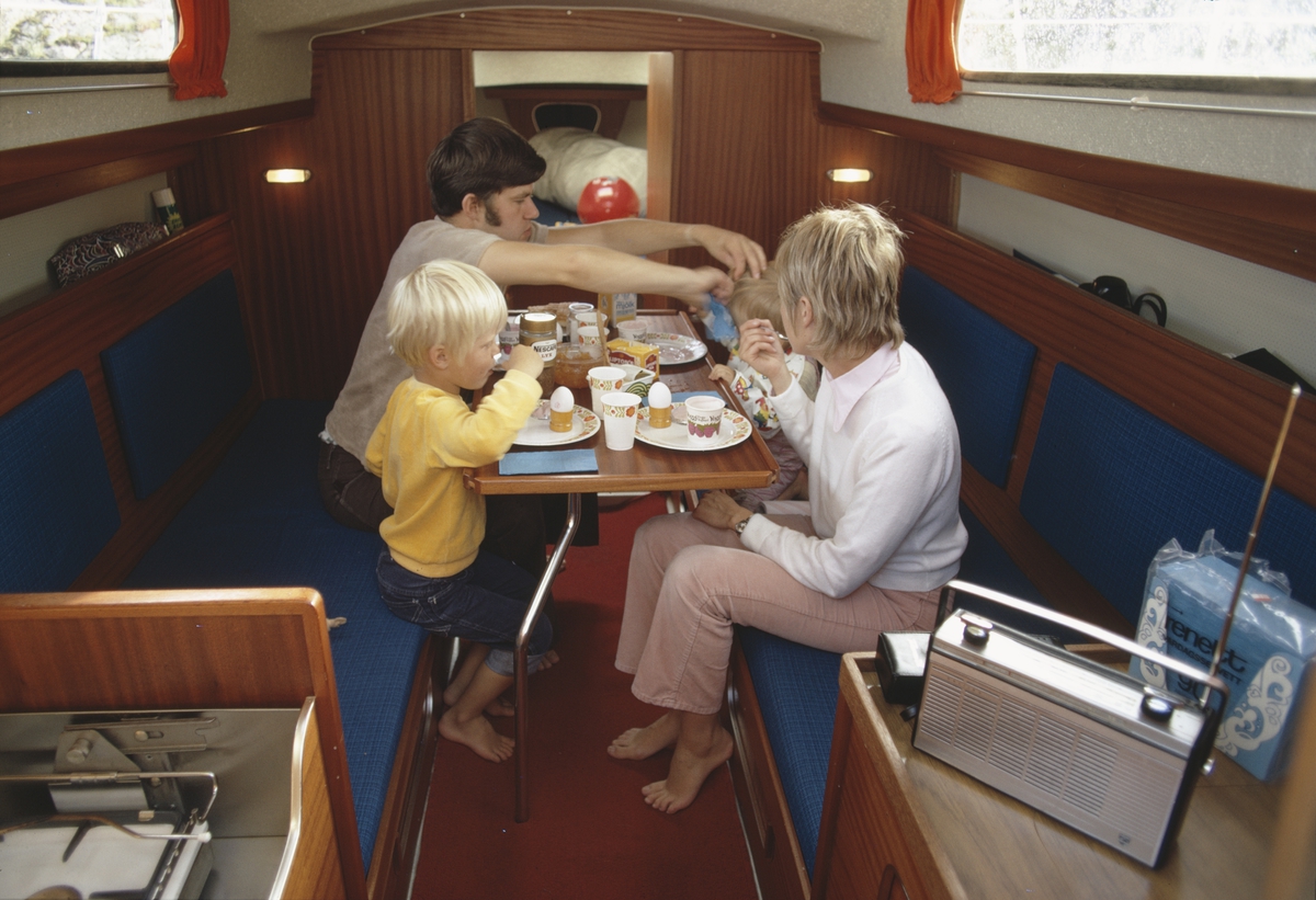Interiör, salong i Albin Vega. En familj äter frukost. Marknadsföringbild.
