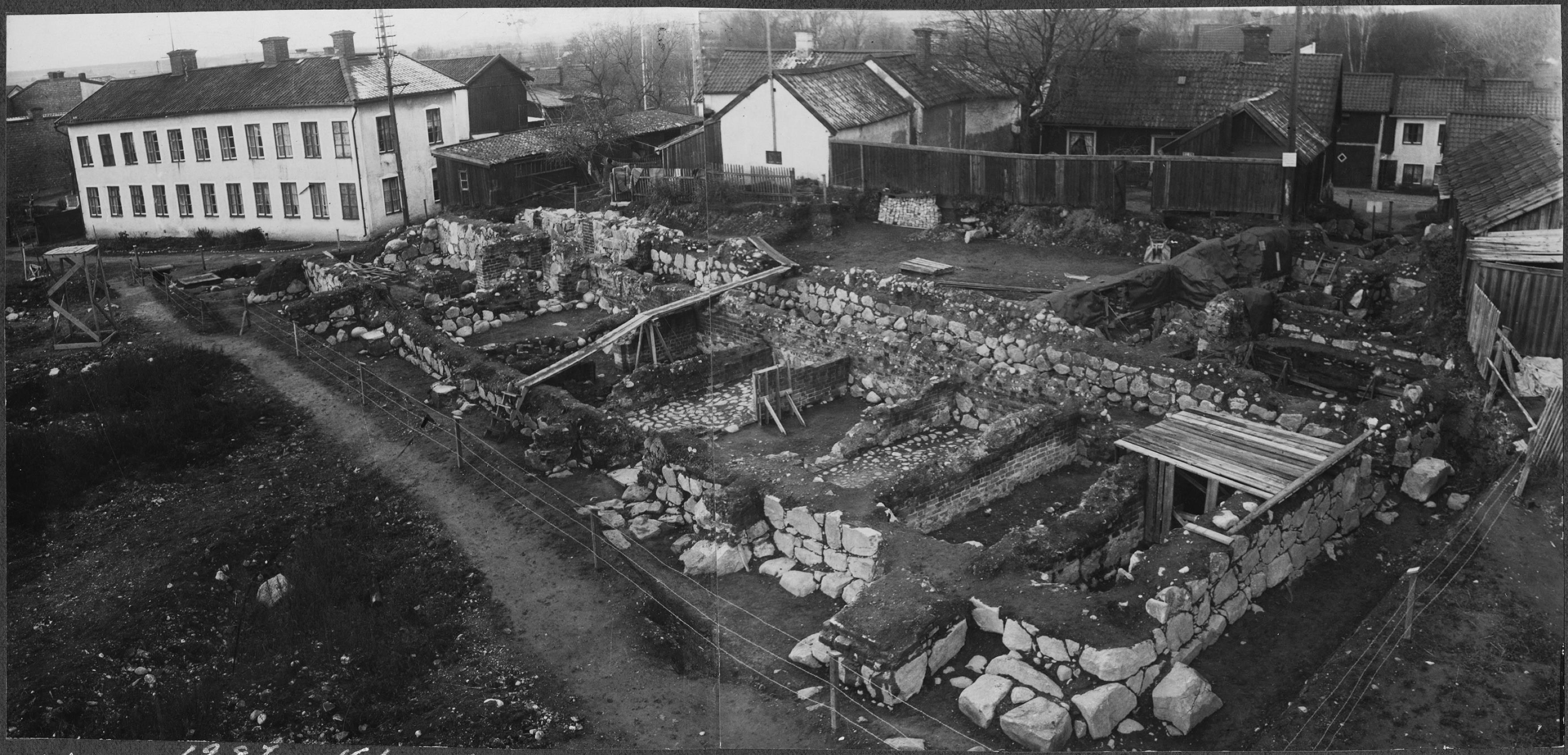 Klosterruinen mot sydost. Samtliga hus på fotot täcker delar av klosterruinen.