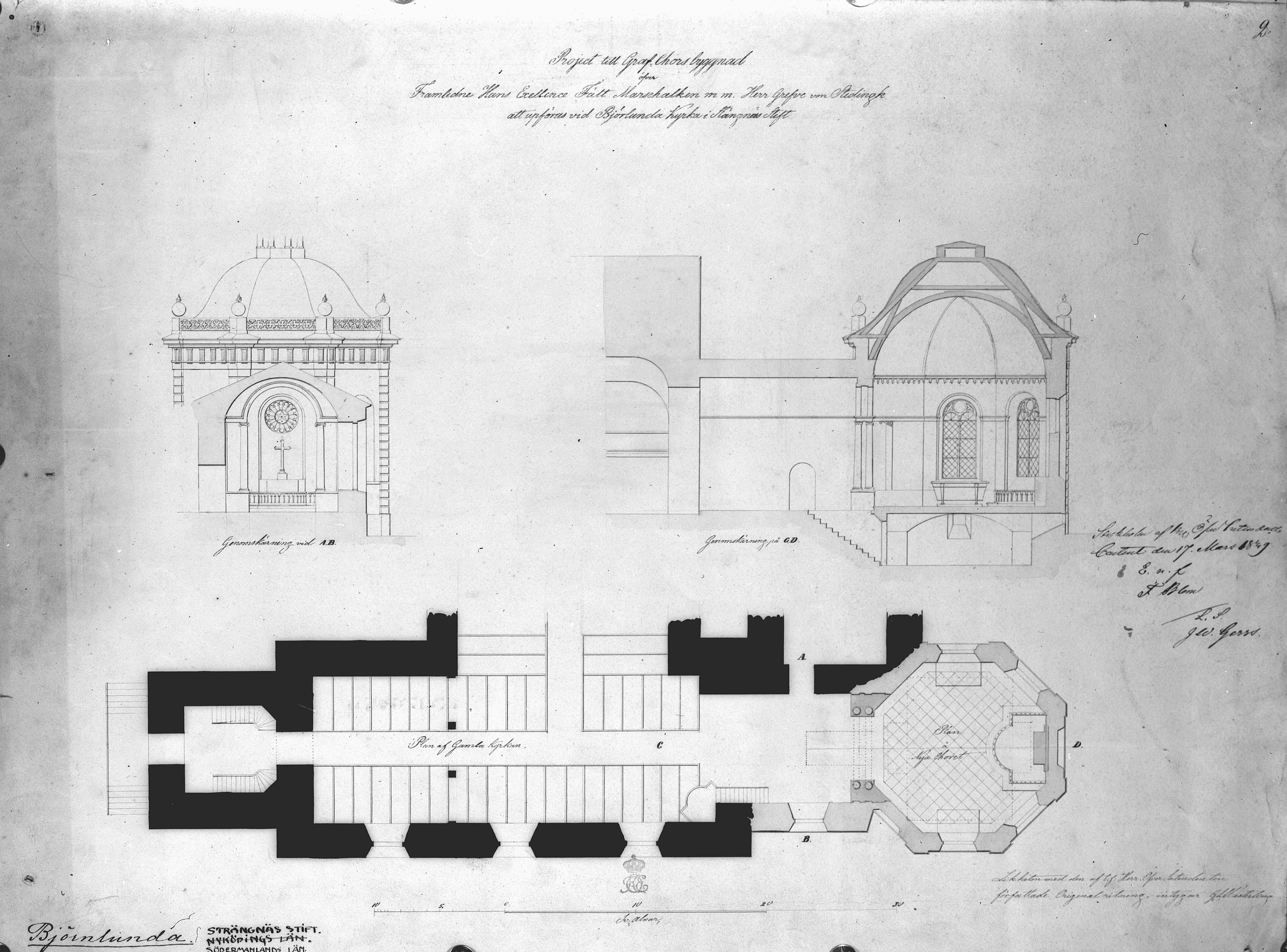 Foto efter ritning över Stedingkska gravkoret, genomskärning och plan.