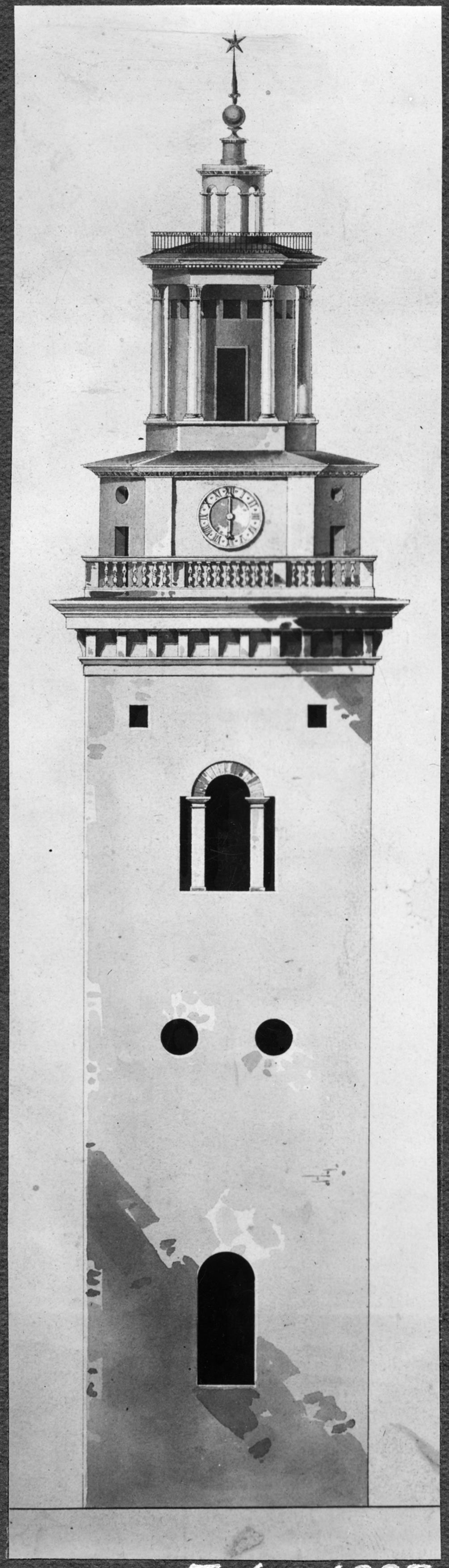Ritning av förslag till tornspira utförd av C. F. Sundvall. Avfotograferad.