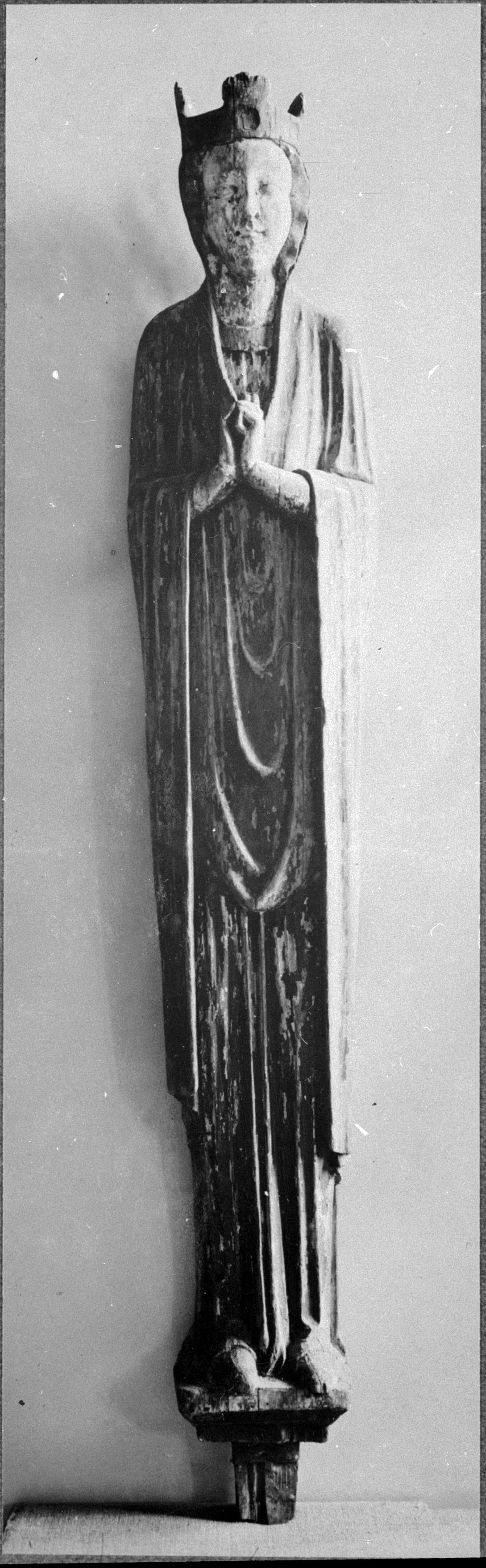 Skulptur, Maria ur en kalvaliegrupp, från 1200-talets mitt av snidad och målad ek. Klädd i grön tunica och röd mantel.