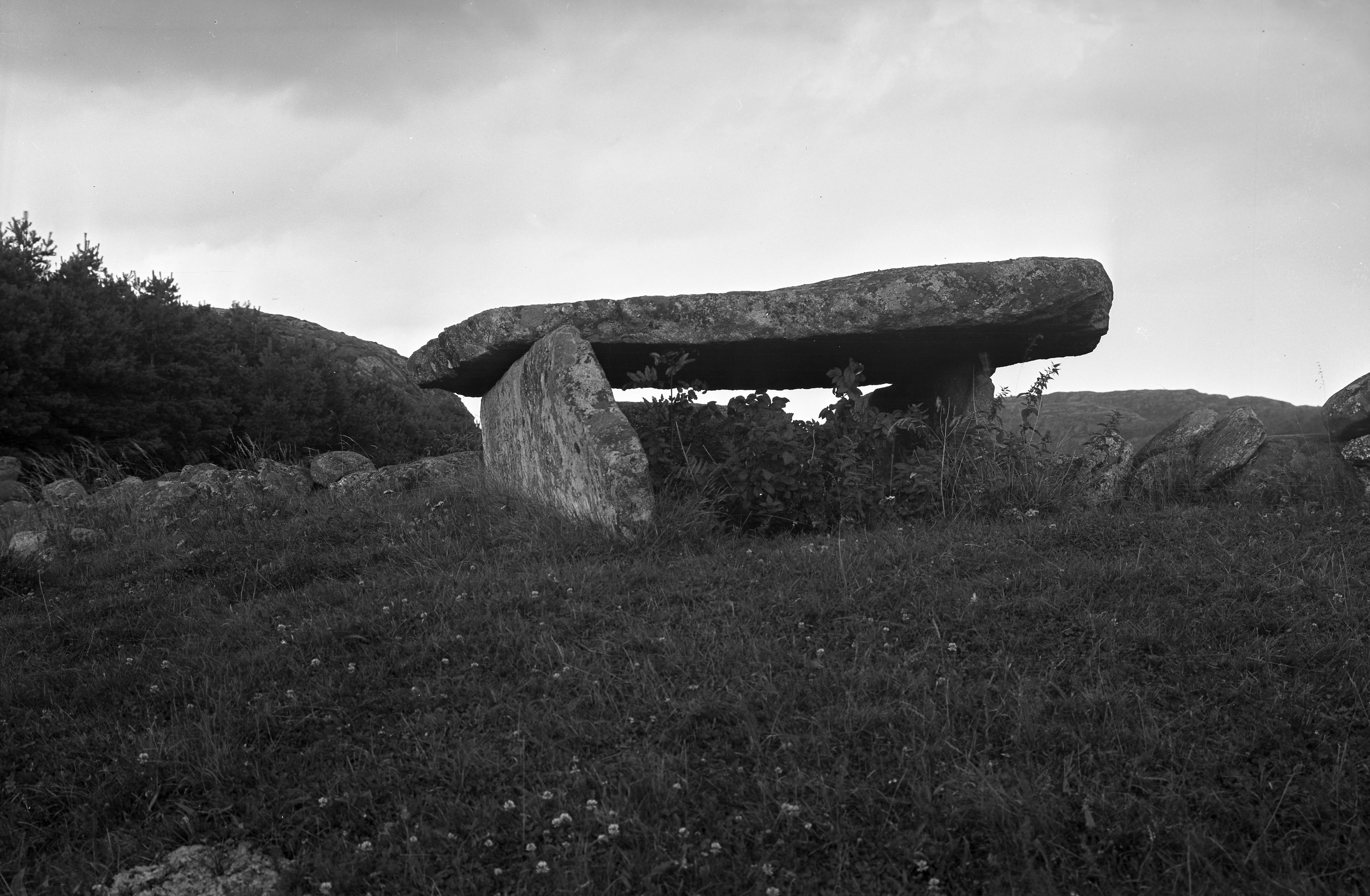 Dös, i omgivande rund stensättning. Kammaren, som av de stenar som står kvar att döma, har varit osedvanligt stor, ca 5 m diam,markeras av 6-7 numera synliga stenar. Anläggningen domineras av den kvarstående takhällen, som till formen är närmast rund. Runt anläggningen ligger 6 tämligen flata stenar, som sannolikt bildat en yttre ram kring kammaren.